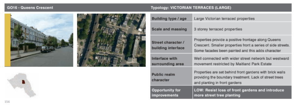 The continuing importance of the original 19thC ordering of urban space – the streets and their interconnection, notwithstanding the comprehensive development of the housing estates in the 60s and 70s – is not recognised as the framework we all live within. Remarkably, the Vision has nothing to say about the future of Malden Road, possibly the most important street in the area. Camden’s 2015 Character Study notes in Gospel Oak that the “The Victorian fabric provides a robust structure with properties fronting onto the residential streets”