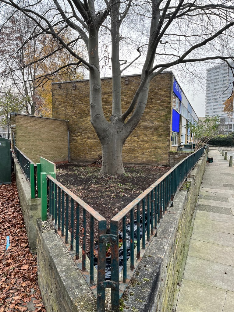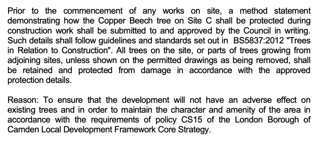 Why is this magnificent copper beech tree boxed in with green painted hoarding? It is because in 2015 Camden Council granted itself permission to develop the area under the tree as a house, with the intention of selling it off to the highest bidder.