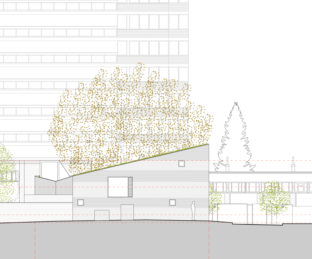 The picture above shows the shape of the house proposed by Camden. This would kill or seriously harm the tree. Branches would need to be cut off to make space for the house. Ironically the planners made the planning permission conditional on protecting the tree.
