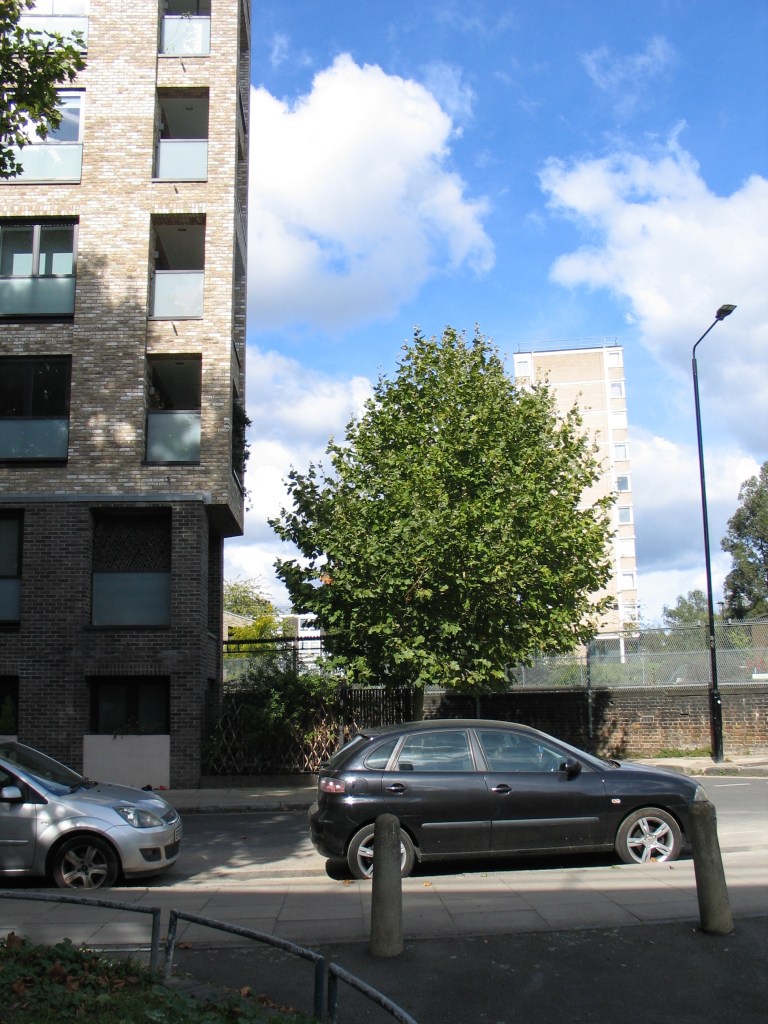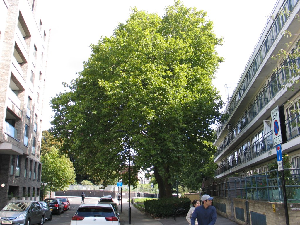 In 2017 when Camden’s redevelopment of the Vicars’s Road workshops was built, a new London Plane tree was planted- on the left in the photo below.