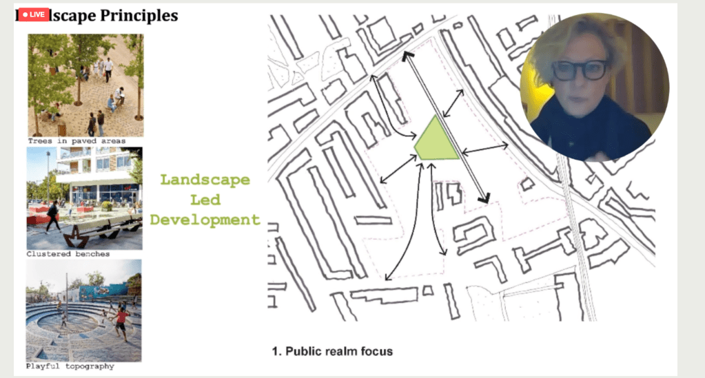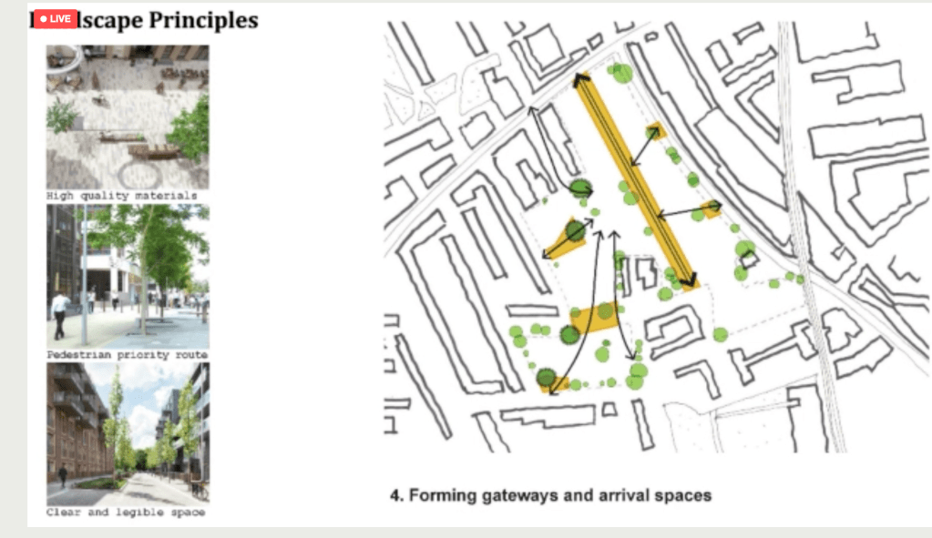 These are not ‘landscape principles’. They are green sausage shapes and dots: what is the green sausage going to Rhyl Street, why are there green dots going up the middle of the road?