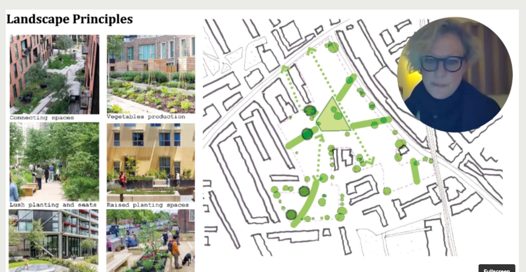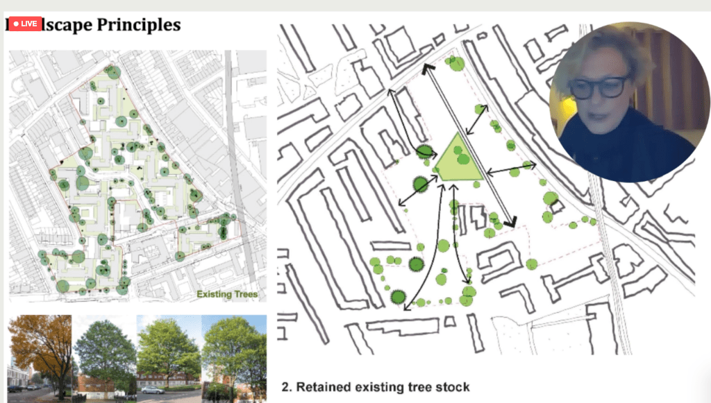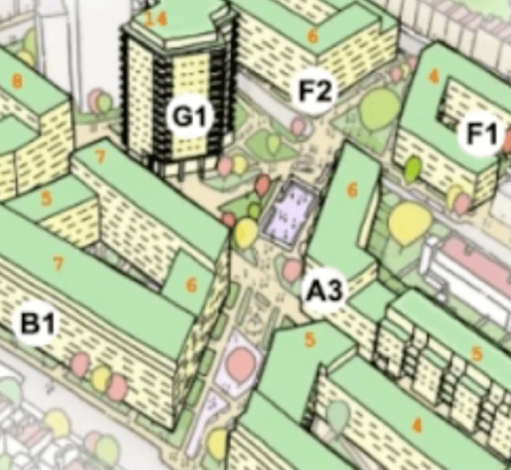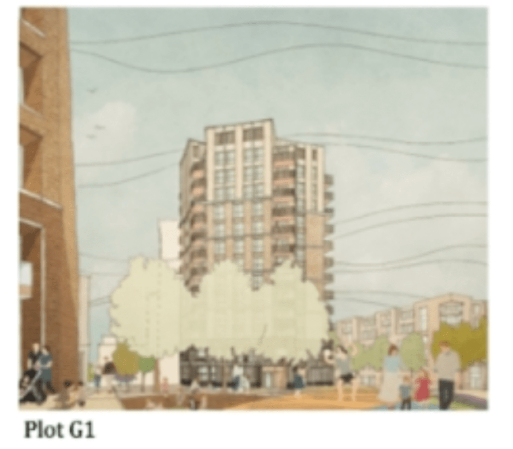 It’s telling that the only view of a major new public space is titled ‘Plot G1’. The purpose of the new square seems to be to provide space for a 14 storey, single-staircase tower with north-facing flats. The image presented (above) differed from the image shown a few days ago at the “drop-in” (below). Differences include air-source heat pumps on the roof and a stiffer, more grandiose composition.