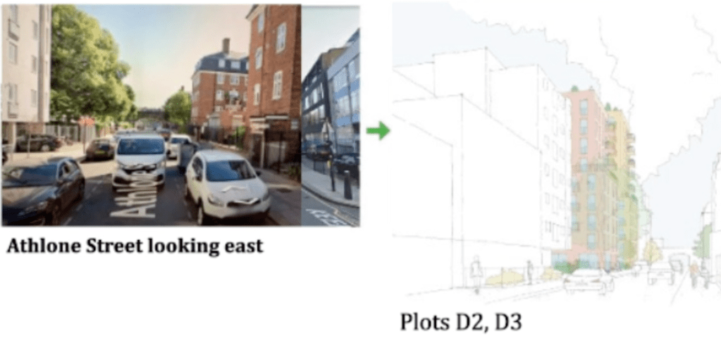 The proposed tall buildings on Athlone Street will completely change the nature of the road and make this part of Kentish Town feel like central London. A ‘cornice line’ at 5 or 6 storey height will do little to mitigate the harm. This is an assault on the well-being of people who live in this area. The history of this street is a lesson of the effects of ignoring the need for adequate daylight and outlook. These proposals represent a return to poor planning which will generate slum conditions.