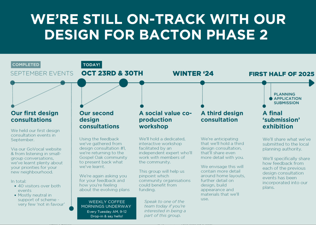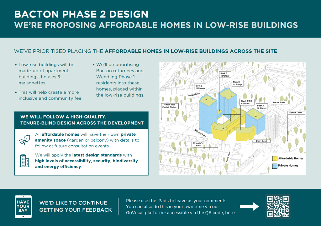 The original estate was built in the 1960s, and comprised a tower of 120 flats and a low-rise area of 99 family-sized homes. The 99 low-rise homes were demolished in 2018, at which time 87 were for social rent. Half of the tenants moved into new homes built by the Council as phase 1. The other half had to move out and were housed elsewhere. Under the current developer’s proposals, the rebuilding of Bacton Low-rise is unlikely to be achieved until 2028, resulting in a loss of homes over a 10 year period. It is very unlikely that the original tenants will return.