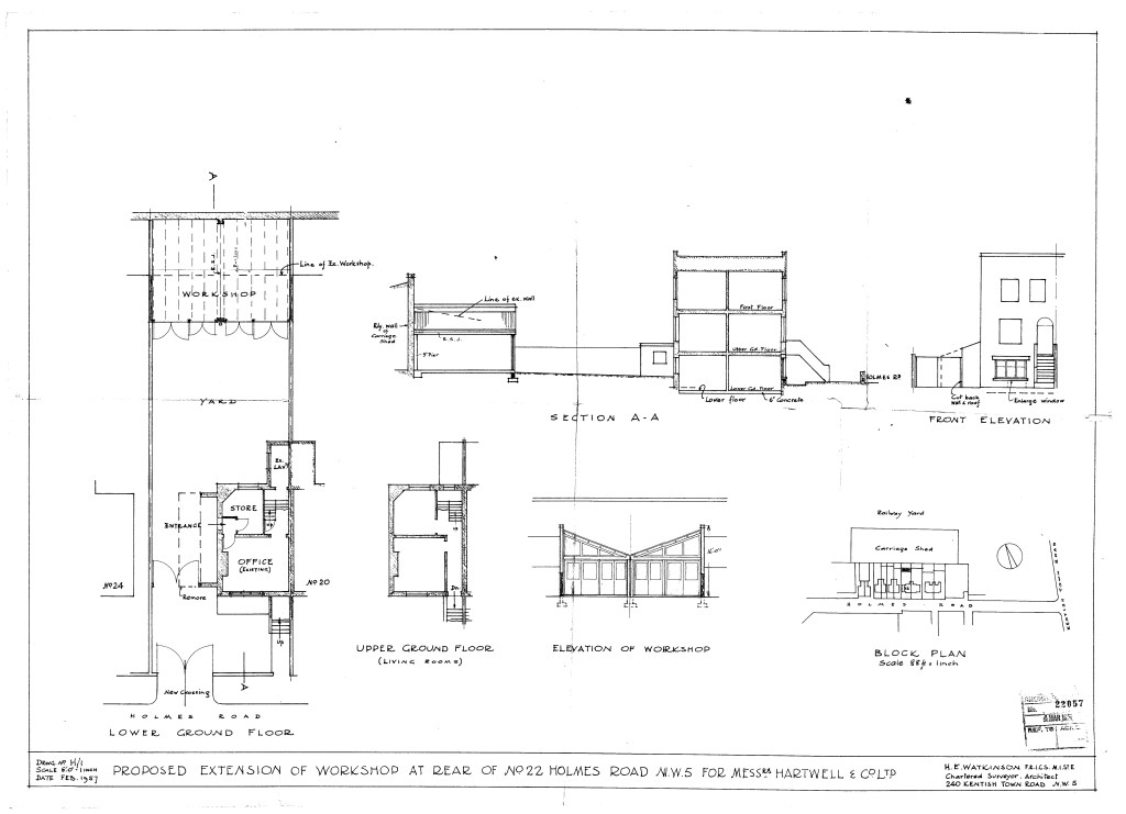 Workshop at rear of 22 Holmes Road, 1957:
