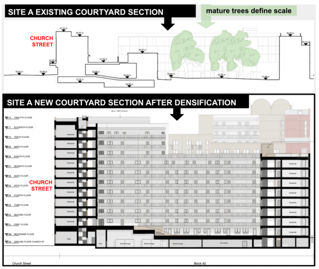 A clearly demoralised design team has been overwhelmed by the challenge of WKTE’s redevelopment and is resorting to all manner of excuses to explain poor performance. I am struck by the discord between the claim the WKTE project is ‘landscape-led‘ and committing so much of the site to poor quality courtyard space on the basis that the scheme is ‘urban‘.