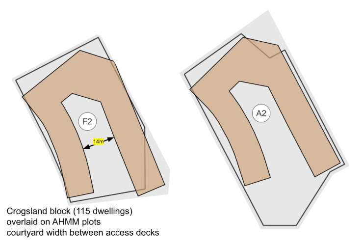 Martin and March considered improved planning meant not “building higher, but …(amalgamating small plots into larger blocks), which allows for lower, more efficient forms like courtyards that preserve open space and daylight”. The courtyard photos of the Crogsland Road scheme show a courtyard which is around 14 metres across (deck to deck) and 17m across (wall to wall). The comparison below suggests the poor precedent set by the Crogsland courtyard should give pause for thought at WKTE.
