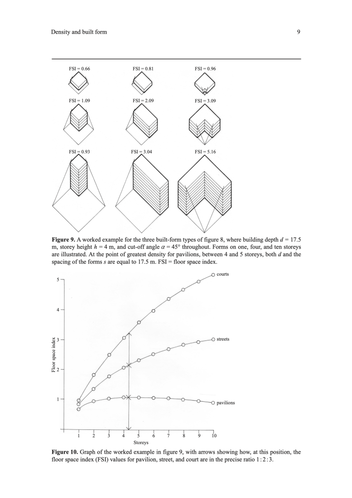 The argument was pursued using a comparison of three simplified building forms that are like Mae’s stereotypes though without historicist trappings: the pavilion (tower), street and perimeter blocks. Common parameters included building depth, storey height and ‘cut-off angle’ i.e. the line joining the base of one building facade to the top of the facade opposite. Out of this came an idea of the densest or most efficient use of a site the area of which has to increase to keep the angle constant as the number of storeys goes up. Efficiency means the highest ratio of total floor area to site area given the constraints. Among those, the cut-off angle was perhaps the most important. Surprisingly the tower is at its densest with just four storeys much less than the courtyard: