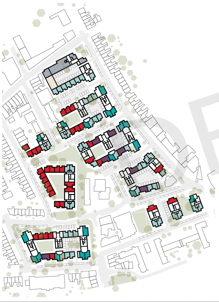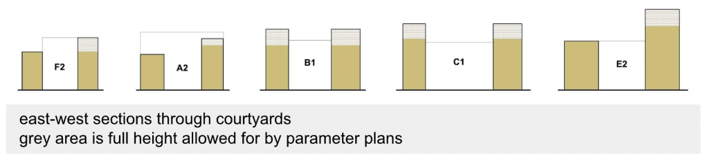 The West Kentish Town Estate (WKTE) redevelopment, led by AHMM Architects, has 12 building plots. Seven will be courtyard buildings containing over 70% of the 856 new homes planned (around 600 in total). They are not in the first phase of work so detailed designs are not yet available. The plots on which they will stand, their maximum size plus other general information is shown in the parameter plans, while the design documents (DD) i.e. the Design Code (DC), the Design and Access Statement (DAS) and Planning Statement (PS) fill in some of the rest of the missing information. The following is a discussion of the proposed courtyard housing based on what is now known about it.
