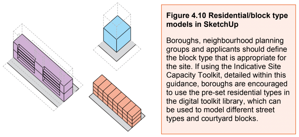 The LPG sets out a sequence of seven steps to model site capacity: only at the sixth is site capacity even mentioned: “Once satisfied with the design option produced, the residential GEA can be taken from the modelled scheme and used to identify indicative site capacity based on tenure and type mixes.“