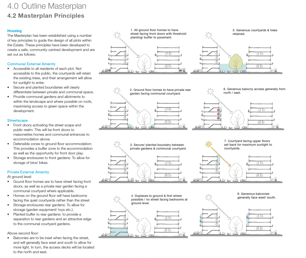 Mentions of ‘typologies’ demonstrated at Denton Estate, St John’s Court, the Dunboyne Estate, the Weedington Estate and Agar Grove Estate are scattered across the planning documents without an explanation of their direct relevance to the WKTE courtyard proposals.